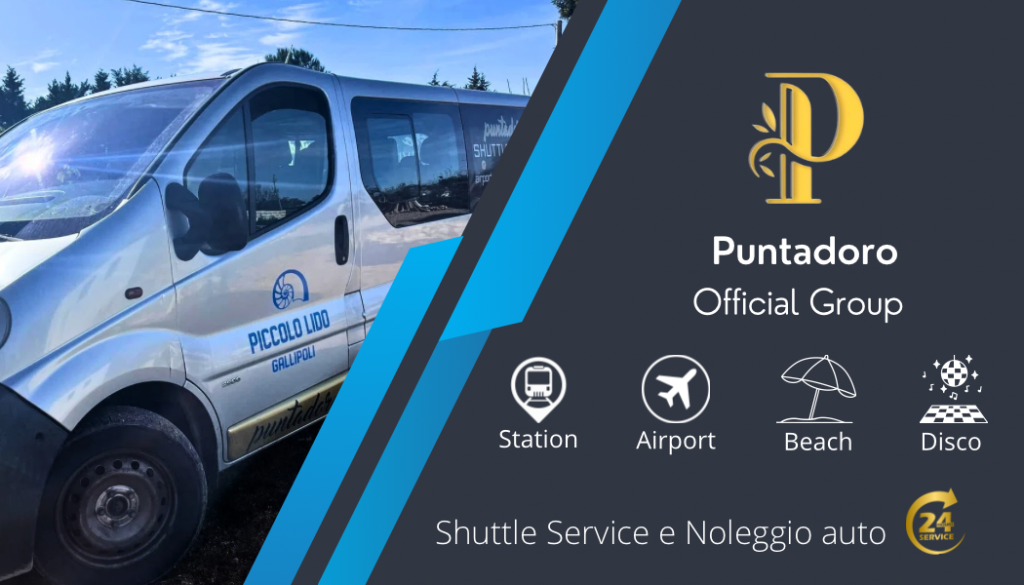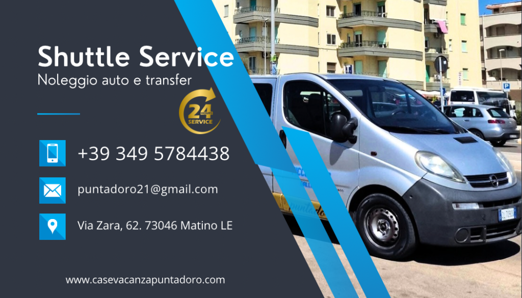Puntadoro “ Shuttle Service “Servizio di Noleggio Auto e Transfer: 5 / 7 / 9 pos ATTIVO H24 Il nostro , servizio di noleggio, garantisce puntualità, comodità e sicurezza.SERVIZIO ATTIVO H24Per viaggi brevi ( nel Salento) oppure viaggi lunghi nel territorio italiano, organizzati e non.Disponiamo di AUTO (suv privato), per viaggi individuali più confortevoli. Prenota Ora